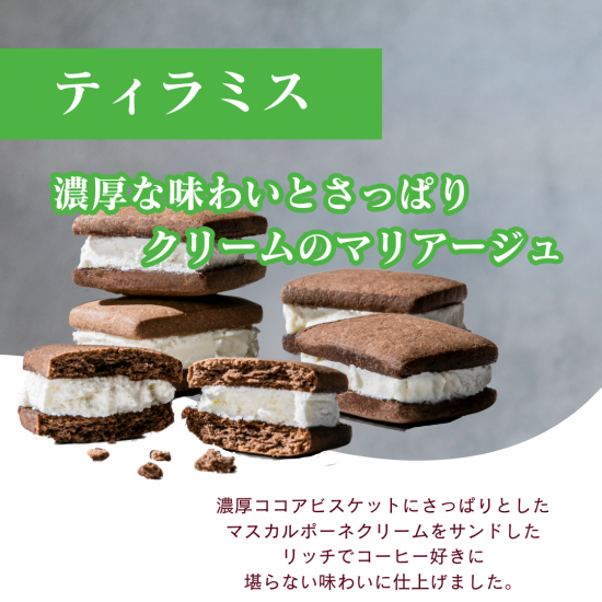 濃厚ココアビスケットになめらかなマスカルポーネクリームをたっぷりとサンド。